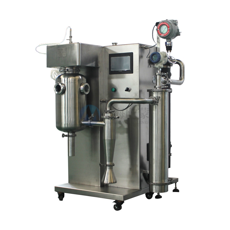 首先在開啟風機,加熱模塊,噴霧干燥機體內(nèi)充入氮氣,要被干燥的液態(tài)物料經(jīng)輸液泵輸送至噴頭處,液態(tài)物料被霧化器霧化成細小液滴,液滴在干燥塔內(nèi)與熱氮氣進行充分的熱交換,物料中的液態(tài)部分被瞬間蒸發(fā),固態(tài)部分形成的粉狀物料沉于塔底,*后經(jīng)過旋風分離器進行氣固分離至物料收集瓶,溶劑經(jīng)過冷凝器回收,氣體循環(huán)利用。